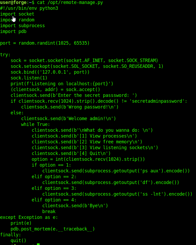 From first shell i ran script sudo /usr/bin/python3 /opt/remote-manage.py